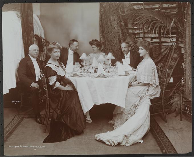 Three men and three women formally dressed, seated at a table at a dinner given to Arnold Bennett, novelist and dramatist, at Harper Brothers.