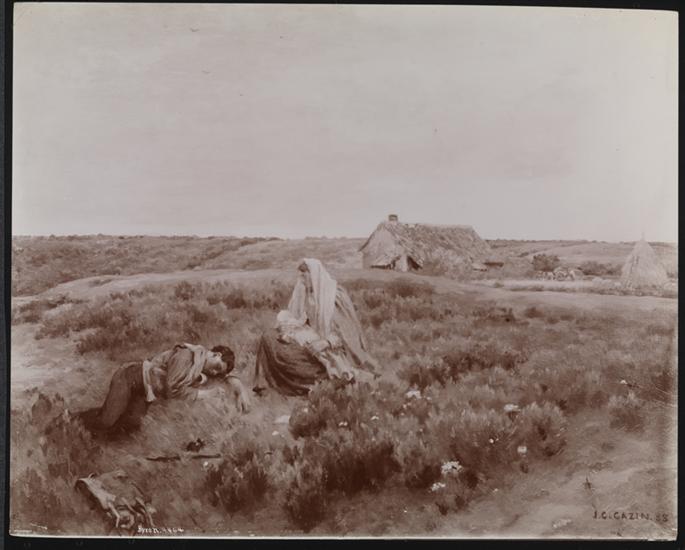 Photograph of a painting of a man, woman and child on a meadow, house in distance; signed "J.C. Cazin. 88."
