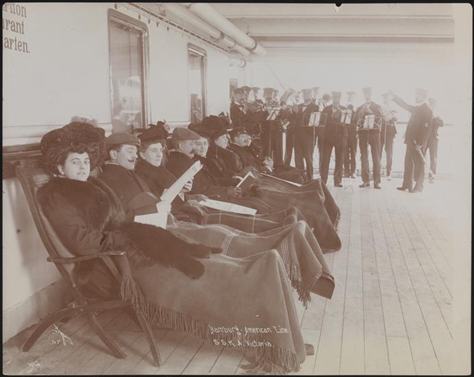 Passengers reclining on deck while a band plays aboard the S.S. "Kaiserin Auguste Victoria".