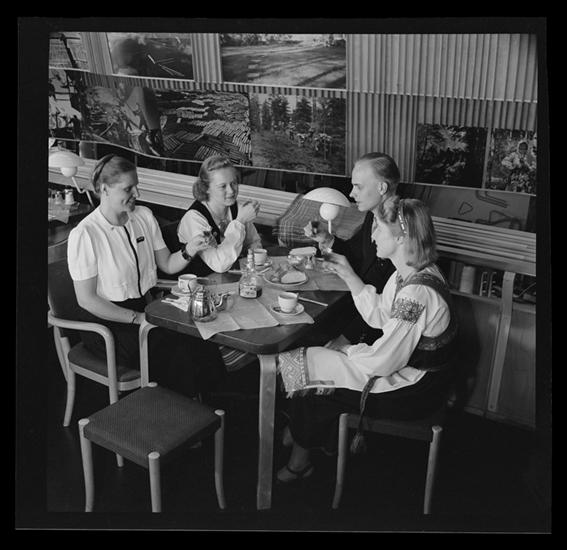 New York Worlds Fair, Electric Utilities Building, detail of waterfall and people.