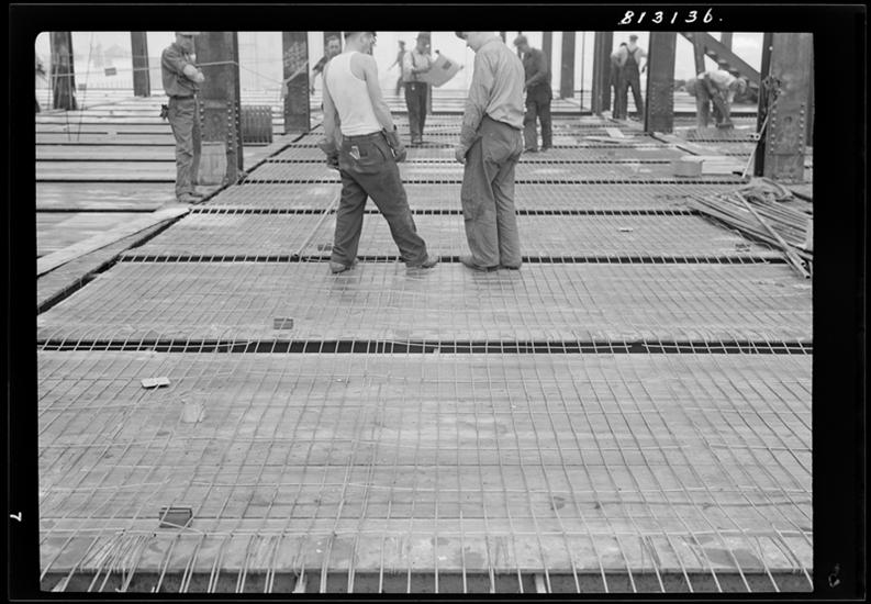 Leroy and Hudson Street. American Dye Stuff Co., "Industrial Still Life", view to show laying steel wire re-enforcement for concrete flooring.