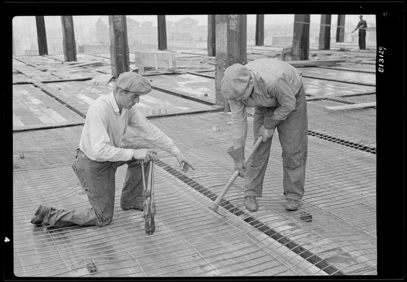 Leroy and Hudson Street. American Dye Stuff Co., under construction. Laying steel wire re-enforcement for concrete flooring.