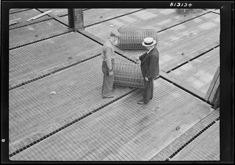 Leroy and Hudson Street. American Dye Stuff Co., "Industrial Still Life", view to show laying steel wire re-enforcement for concrete flooring.
