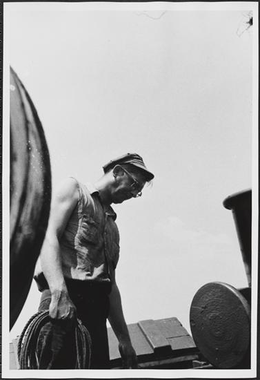 [Crew member working on the ferry.]