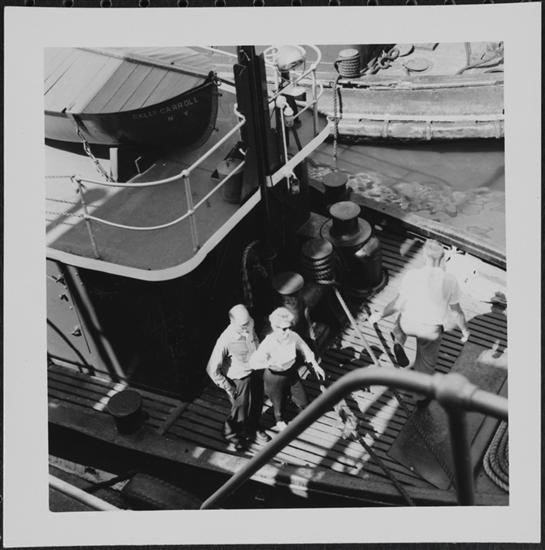 [Travelers on deck of ship looking at Carol Moran and Peter Moran tugboats.]