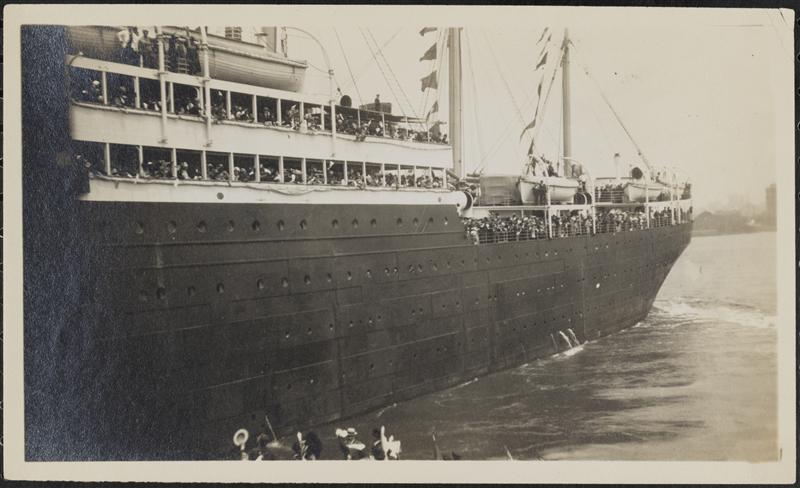 [Ship arriving or leaving port as crowd waits.]