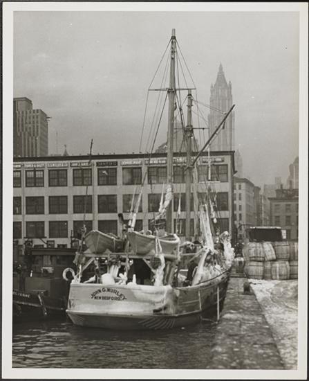 ["John G. Murley" docked by the Brooklyn Bridge.]