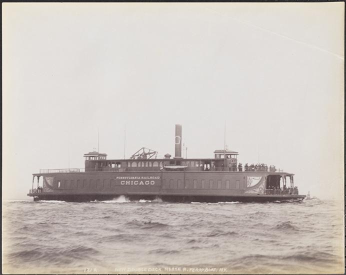 [View of waterfront activity along the Hudson River from deck of ship.]