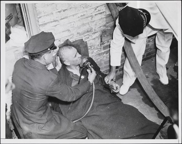 [Doctor treating fireman overcome by fumes at cold storage plant fire.]