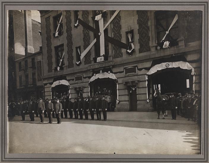 [Horse-drawn fire engine outside the Central Fire Station.]