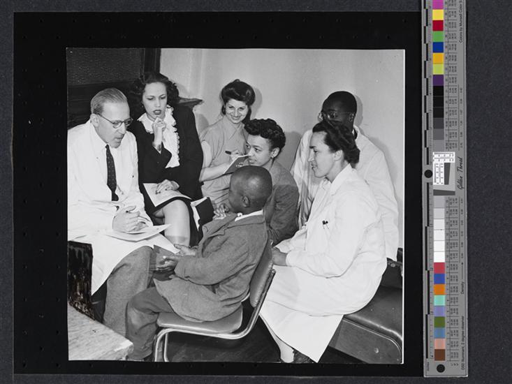 [Staff conference at the Lafargue Clinic. Dr. Fredric Wertham in center and Dr. H. L. Mosse standing to present a case.]