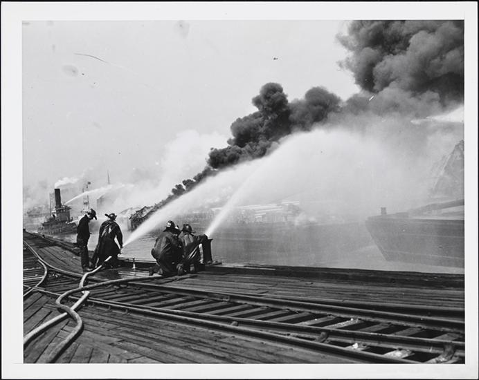 [Doctor treating fireman overcome by fumes at cold storage plant fire.]