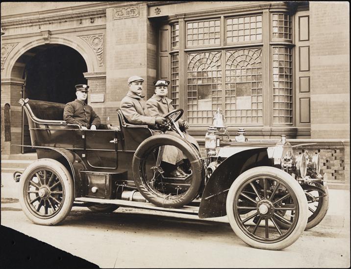 Chief Croker and aid Captain John Rush. [Two firemen in car.]