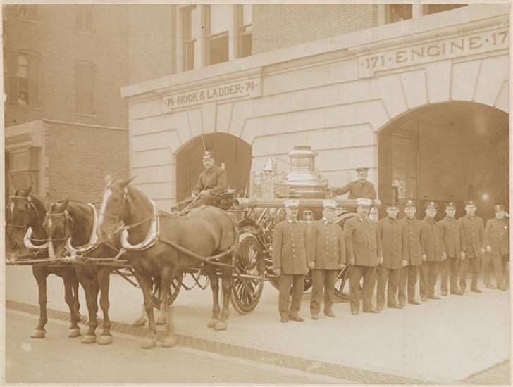 [Horse-drawn fire engine outside the Central Fire Station.]