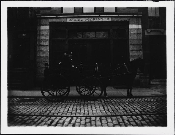 [Firemen with horse-drawn fire engine outside of the station for Engine Company 18.]