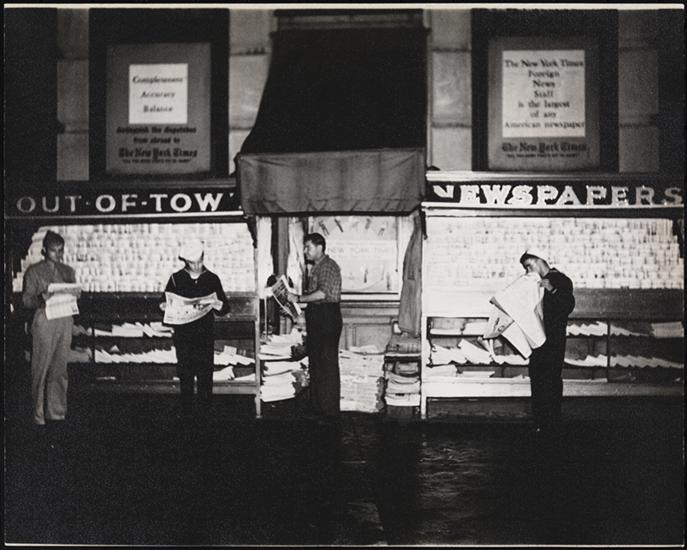 Catching Up On News Back Home. [Soldiers at a newspaper stand.]