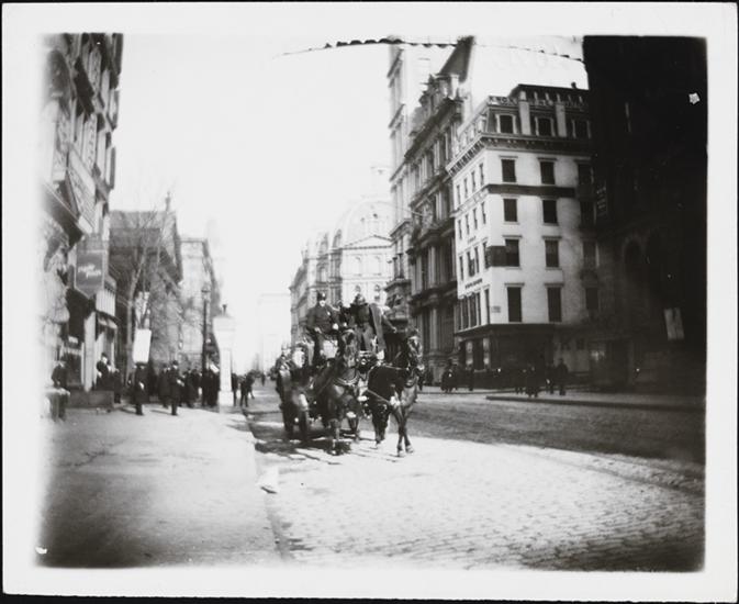 [Horse-drawn fire engine outside the Central Fire Station.]