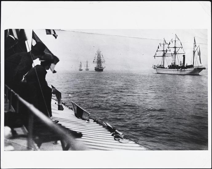 [Photograph of a drawing of the reception and naval procession for the arrival of the Statue of Liberty.]