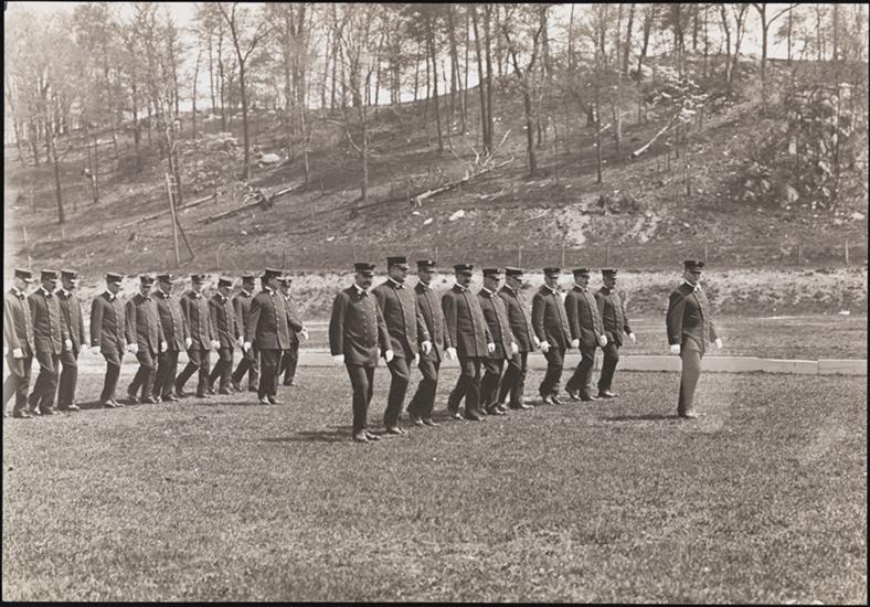 [Fire fighters marching in a field.]