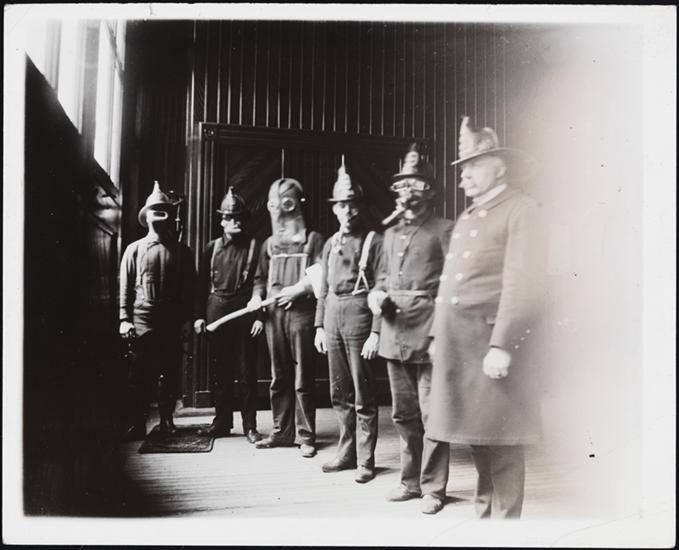 [Firemen in smoke helmets.]