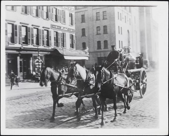 [Horse-drawn carriage leaving fire station.]