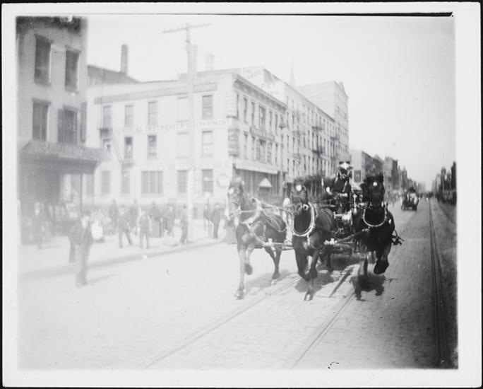 [Horse-drawn fire engine outside the Central Fire Station.]
