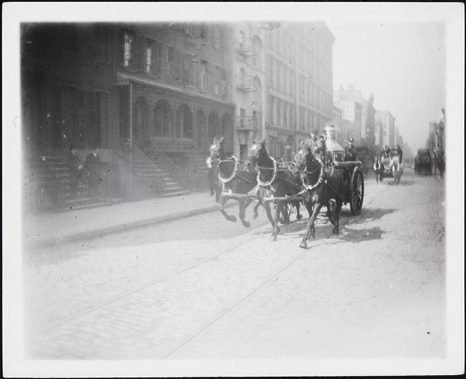 [A. Horse-drawn fire equipment in a parade ; B. Horse-drawn fire equipment in a parade.]