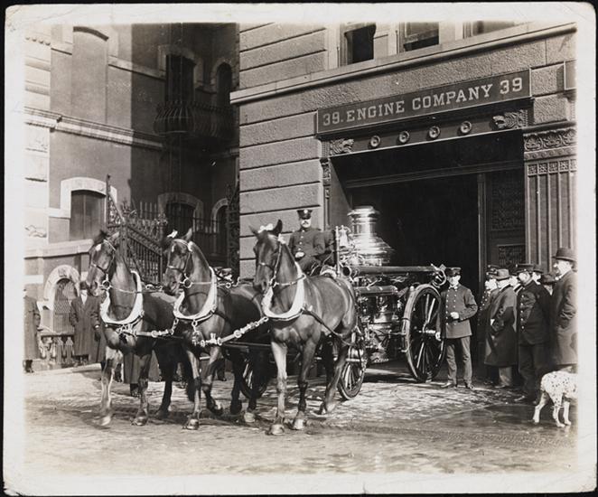 [Horse-drawn fire engine outside the Central Fire Station.]