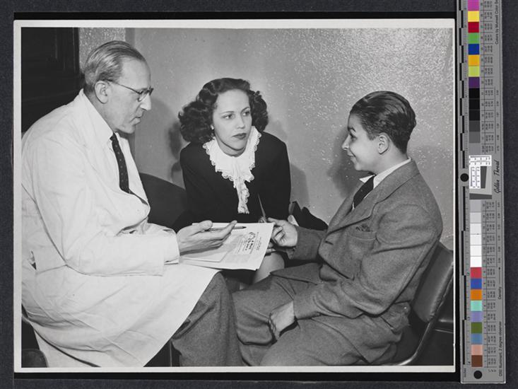 [Staff conference at the Lafargue Clinic. Dr. Fredric Wertham in center and Dr. H. L. Mosse standing to present a case.]