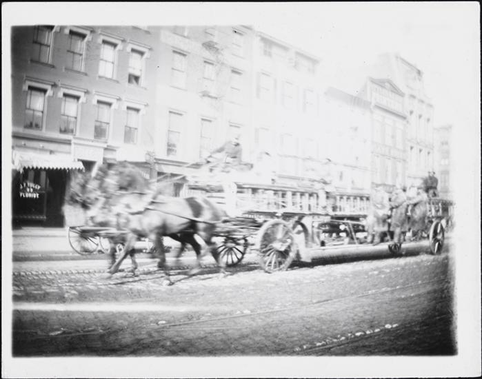 [Horse-drawn fire engine outside the Central Fire Station.]