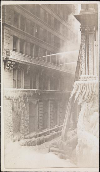 [Firefighting equipment covered in ice at the Equitable Building fire.]