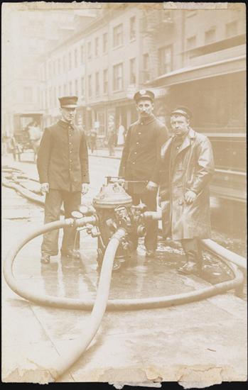 [Group portrait of firemen, including Ed Worth, Chief of 3rd Battalion.]