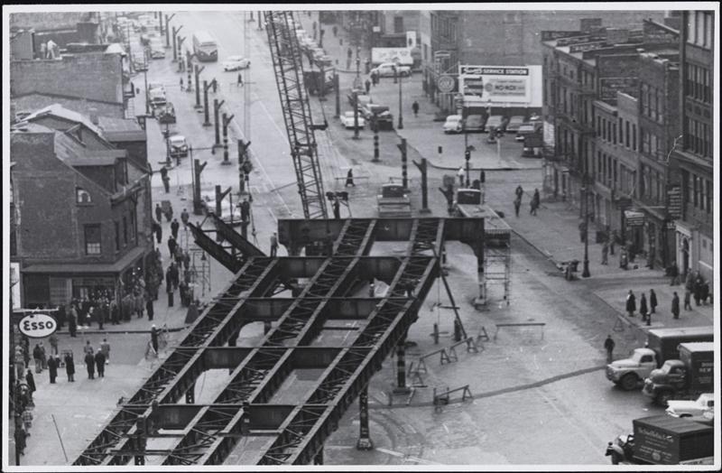 [Cutting through trusses of the Third Avenue El near Cooper Square.]