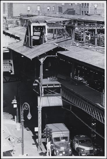 [Cast iron column supporting the stairway at the 9th Street El station.]