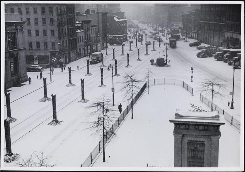 [Cutting through tresses of the Third Avenue El near Cooper Square.]