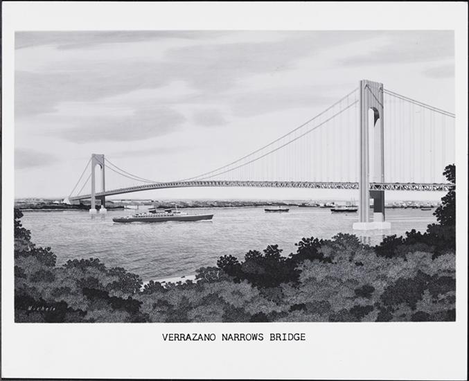 Verrazano Narrows Bridge. Construction view from John Paul Jones Park
