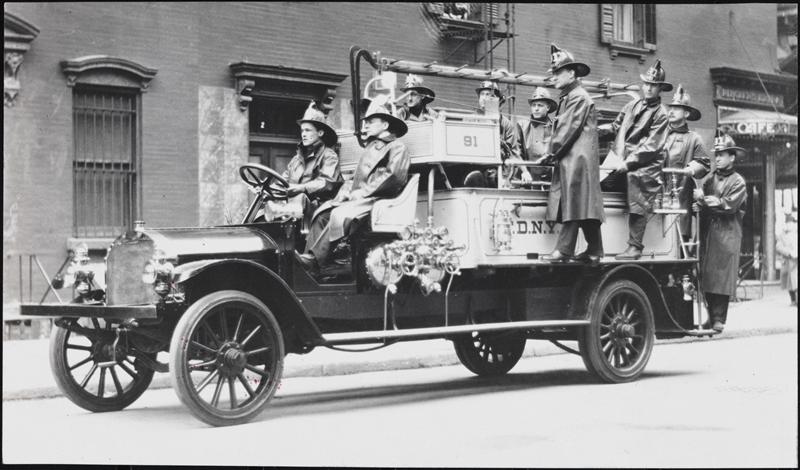 [Early motorized fire engine.]