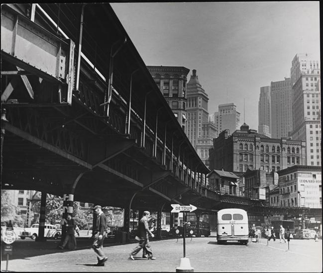 [Looking west along Wall Street at a northbound train running above Pearl Street on the South Ferry Branch of the Third Avenue El.]