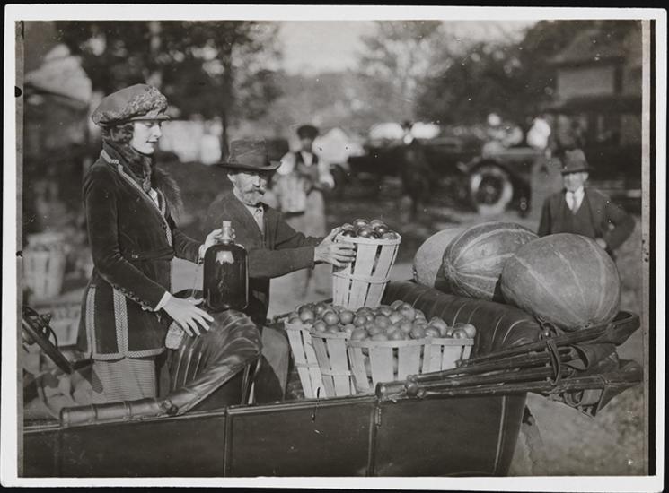[Men buying apples at a farm.]