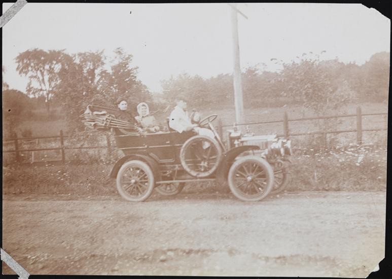 [Early car with three passengers.]