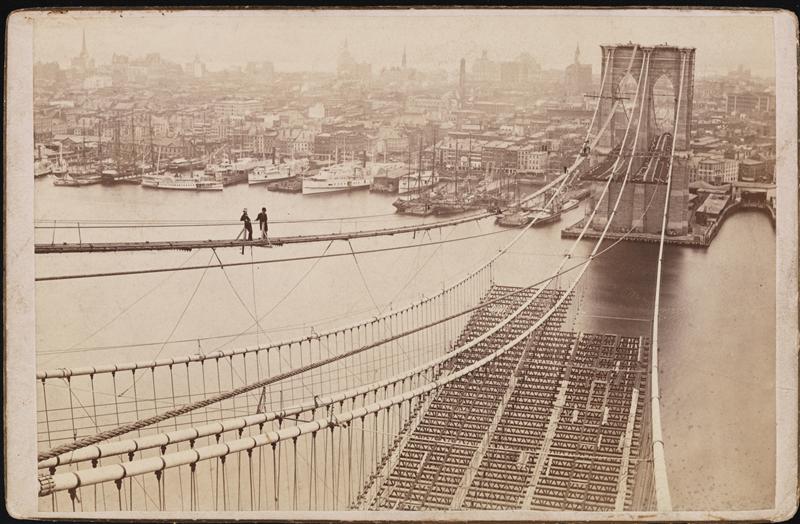 [Men walking on cables during the construction of the Brooklyn Bridge.]