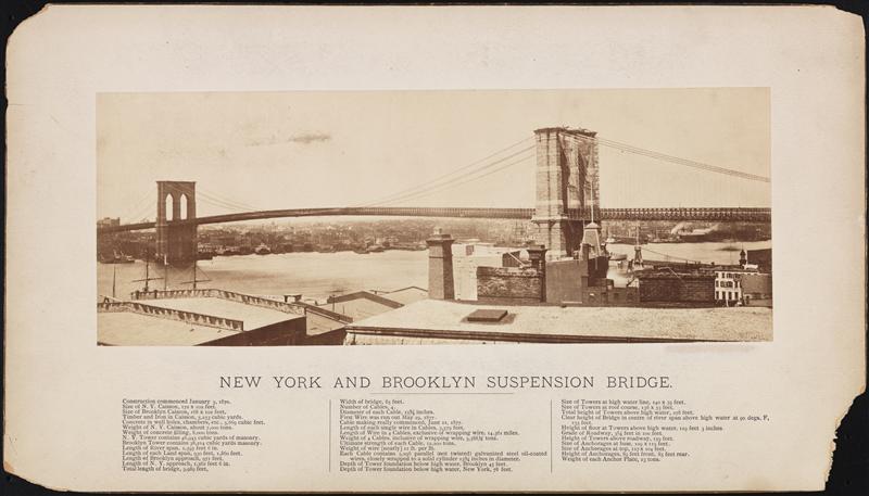 [A. Construction of the Brooklyn Bridge ; B. Brooklyn Bridge.]