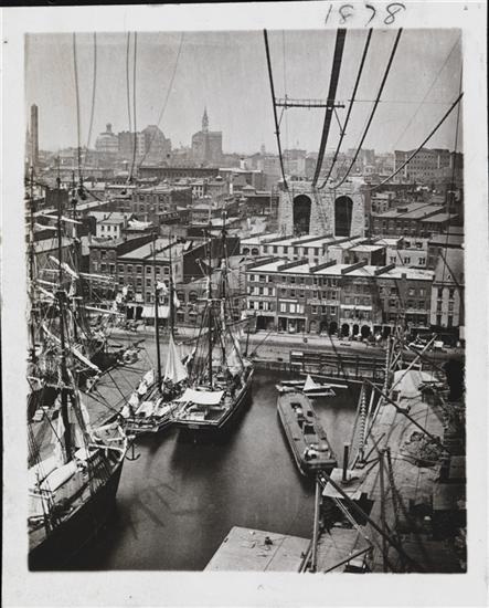 [A. Construction of the Brooklyn Bridge ; B. Brooklyn Bridge.]