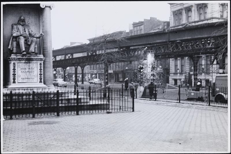 [Cutting through tresses of the Third Avenue El near Cooper Square.]