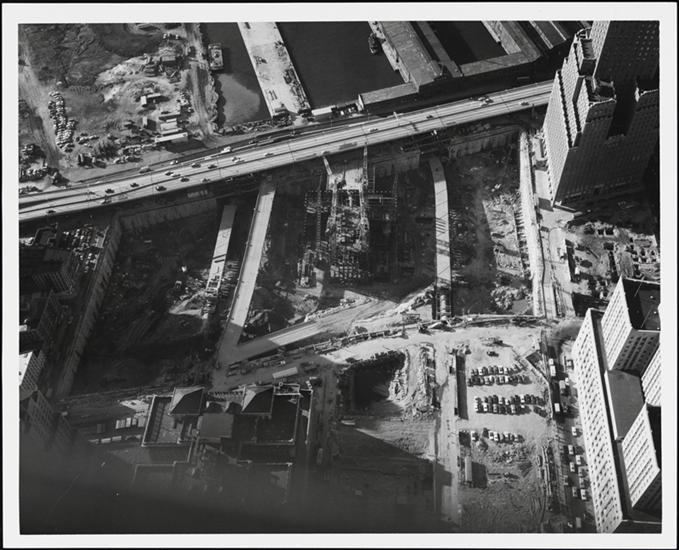[Aerial view of construction of the World Trade Center.]
