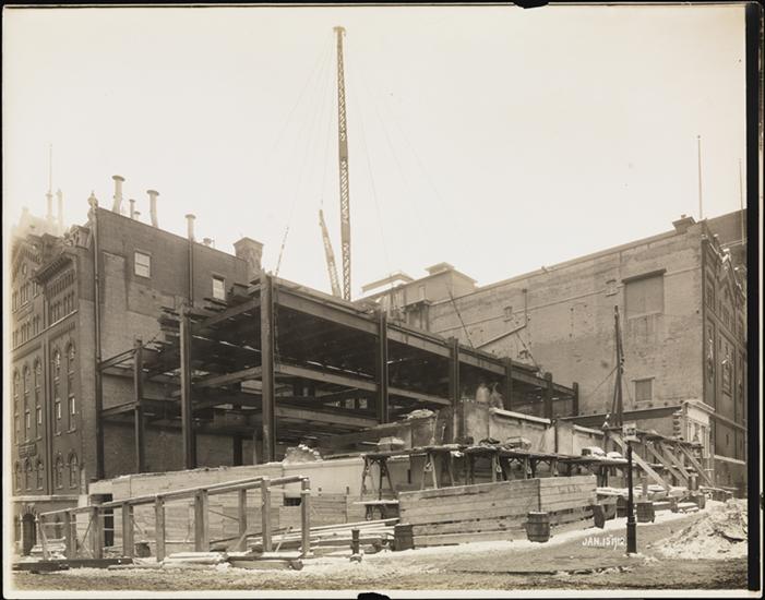 [Aerial view of the construction of the World Trade Center, from the Hudson River.]