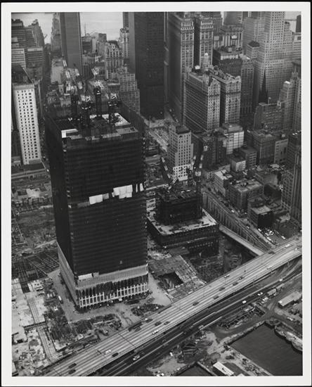[Aerial view of the World Trade Center looking toward the Hudson River.]