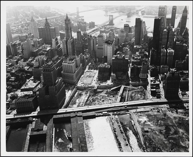 [Aerial view of the construction of the World Trade Center, from the Hudson River.]