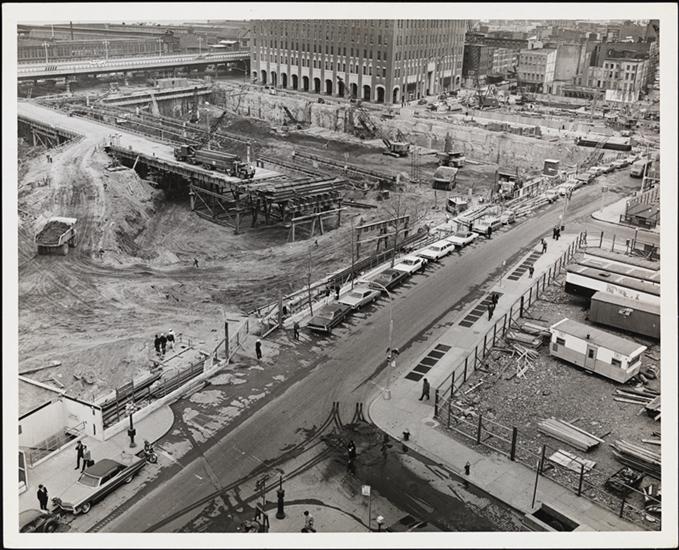[Aerial view of the construction of the World Trade Center, from the Hudson River.]