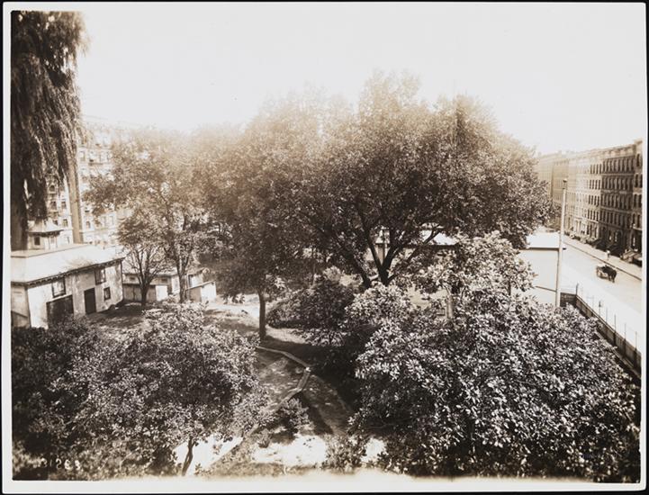 [Watt-Pinkney Mansion's yard surrounded by apartment buildings.]
